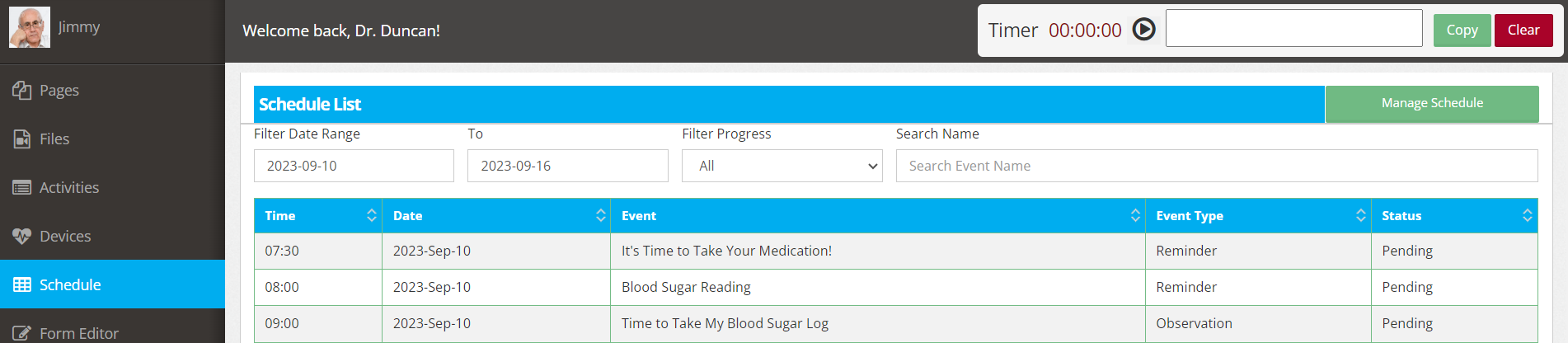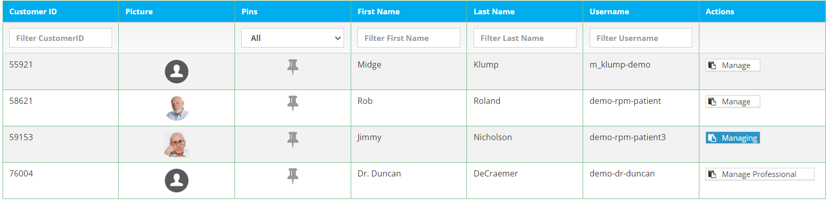 When viewing your list of patients, select the individual you are looking to create a reminder for with the ‘manage’ button. Note if it reads ‘managing’ on the patient profile you can continue to the next step as you currently have them selected. In this case we are already managing test-patient Jimmy Nicholson.