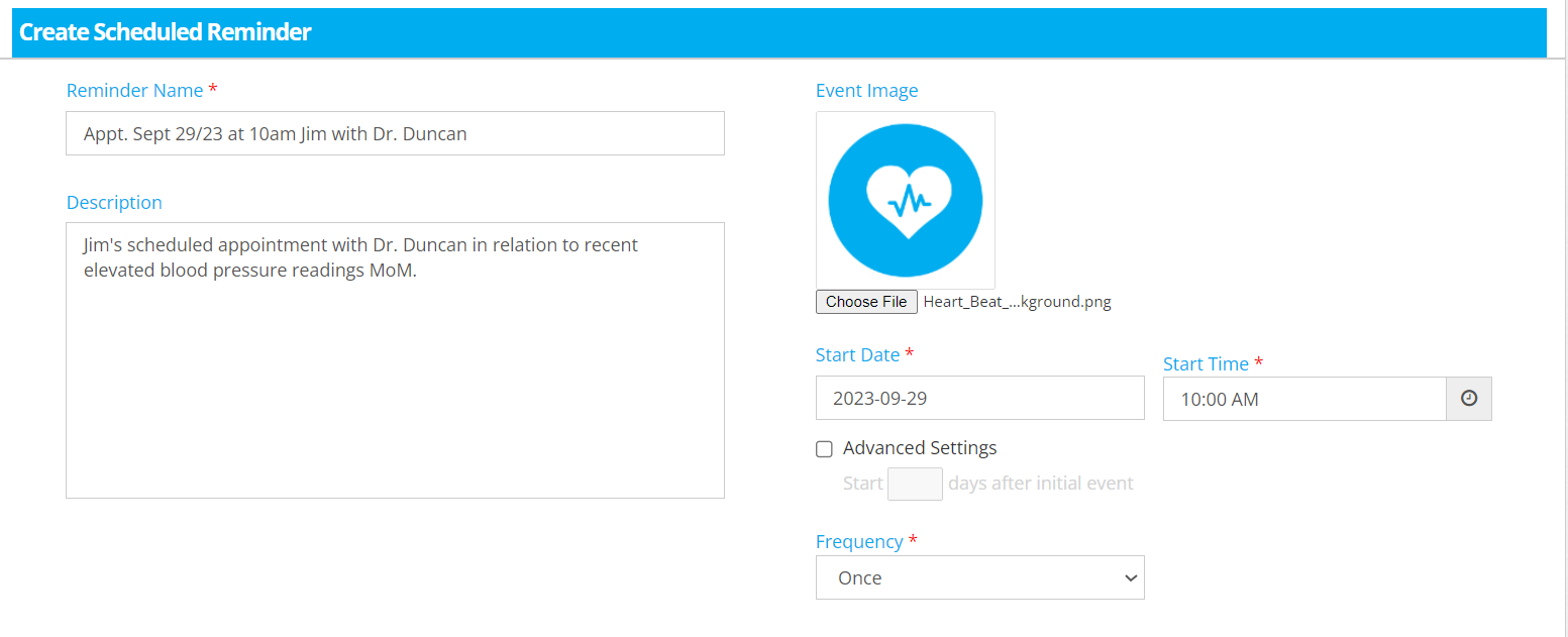 When you are happy with your reminder, select ‘save’. You may choose to add additional reminders customized to the needs of your organization – in the example above we are setting up reminders for patient Jimmy Nicholson for an upcoming appointment.